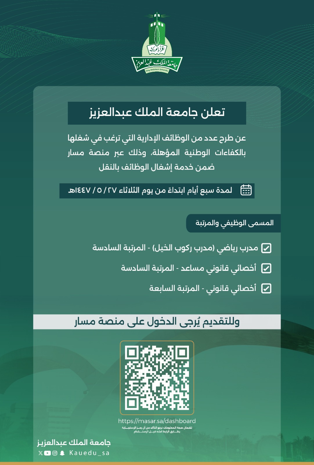 تعلن جامعة الملك عبدالعزيز عن طرح عدد من الوظائف الإدارية عبر منصة مسار ضمن خدمة إشغال الوظائف بالنقل، وذلك لمدة سبعة أيام على النحو التالي: