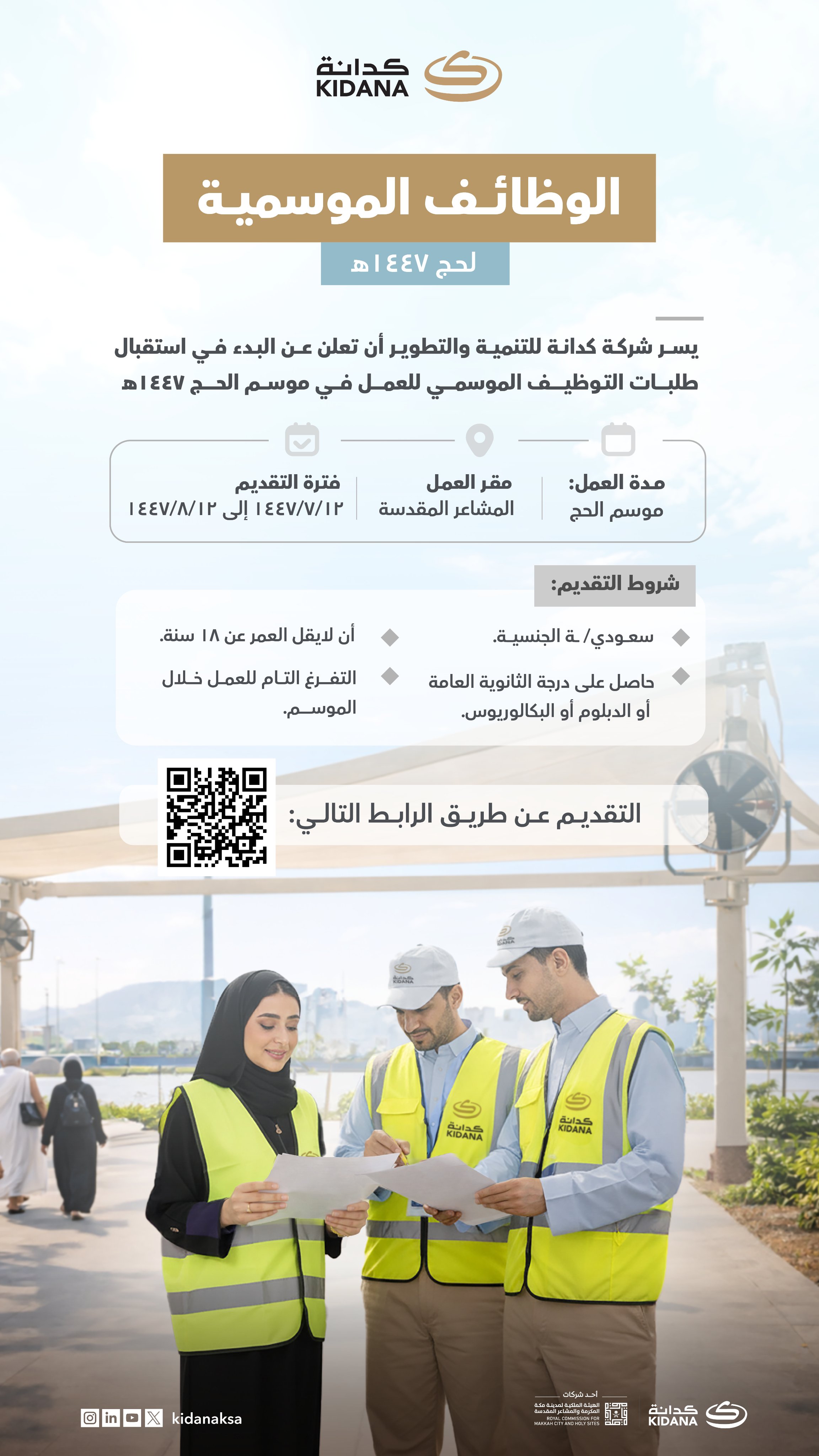تعلن شركة كدانة للتنمية والتطوير (الذراع التنفيذي للهيئة الملكية لمدينة مكة المكرمة والمشاعر المقدسة) عن بدء التقديم في برنامج الوظائف الموسمية لحج 1447هـ لتمكين الكفاءات الوطنية من الإسهام في إثراء تجربة ضيوف الرحمن على النحو التالي:
