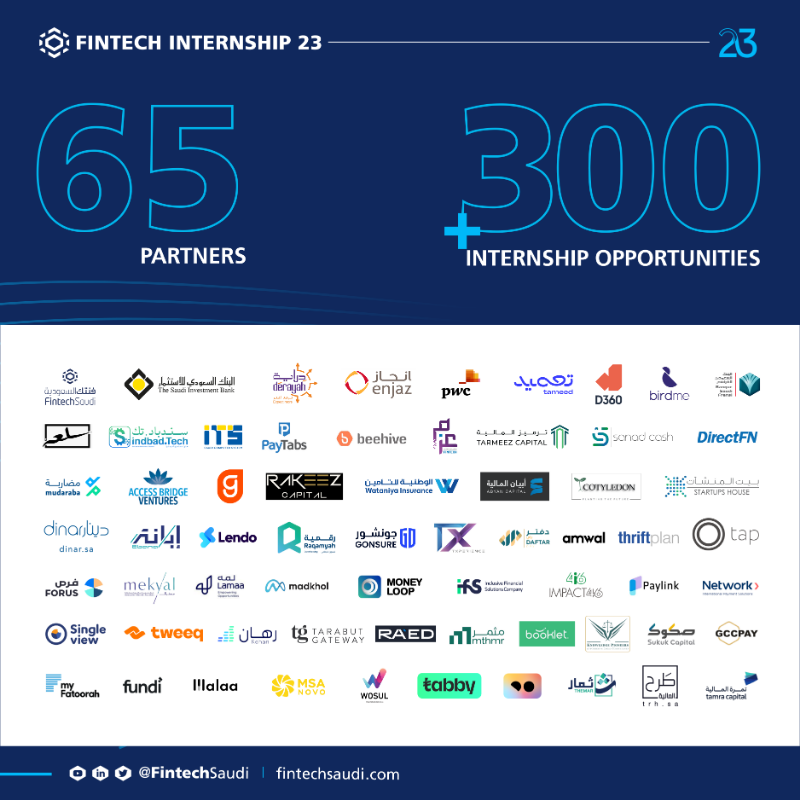تعلن فنتك السعودية عن فتح باب التسجيل لبرنامج تدريب فنتك 23 في نسخته السادسة بالتعاون مع شركائها بطرح (300) فرصة تدريبية في أكثر من (65) جهة حكومية ومؤسسة مالية وبنوك وشركات كبرى على النحو التالي: