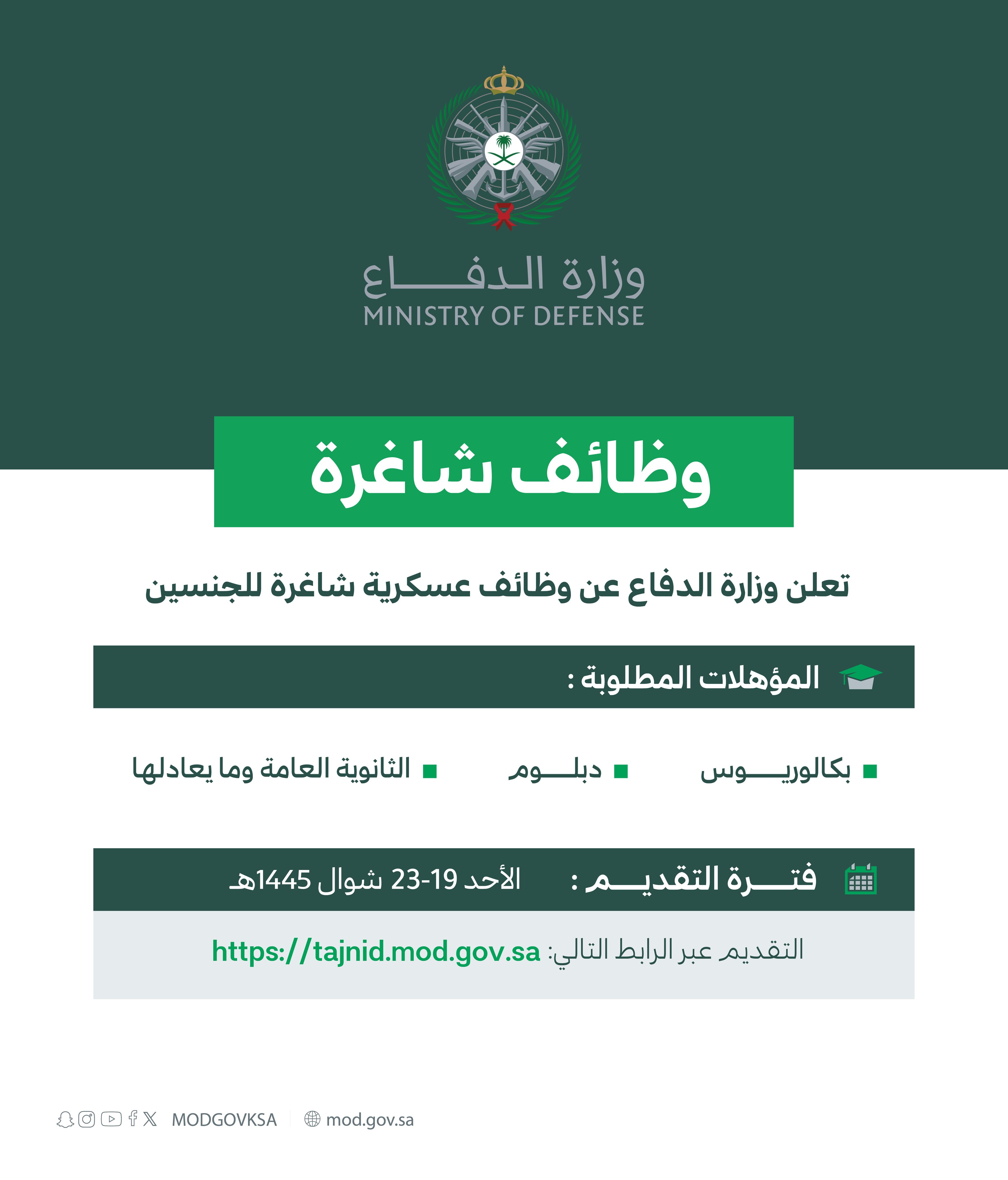 تعلن وزارة الدفاع (الإدارة العامة للقبول والتجنيد بالقوات المسلحة) عن فتح باب القبول والتجنيد الموحد (للرجال والنساء) في القوات المسلحة وأفرعها خلال العام 1445هـ للإلتحاق في الخدمة العسكرية من رتبة (جندي) إلى رتبة (رقيب) على النحو التالي: