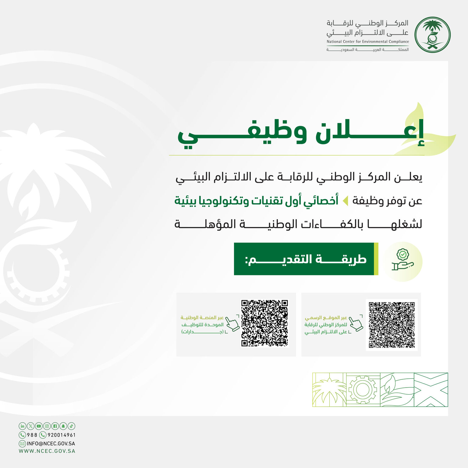 يعلن المركز الوطني للرقابة على الإلتزام البيئي عن توفر وظيفة شاغرة بمسمى (أخصائي أول تقنيات وتكنولوجيا بيئية) لذوي الخبرة من حملة البكالوريوس فأعلى على النحو التالي: