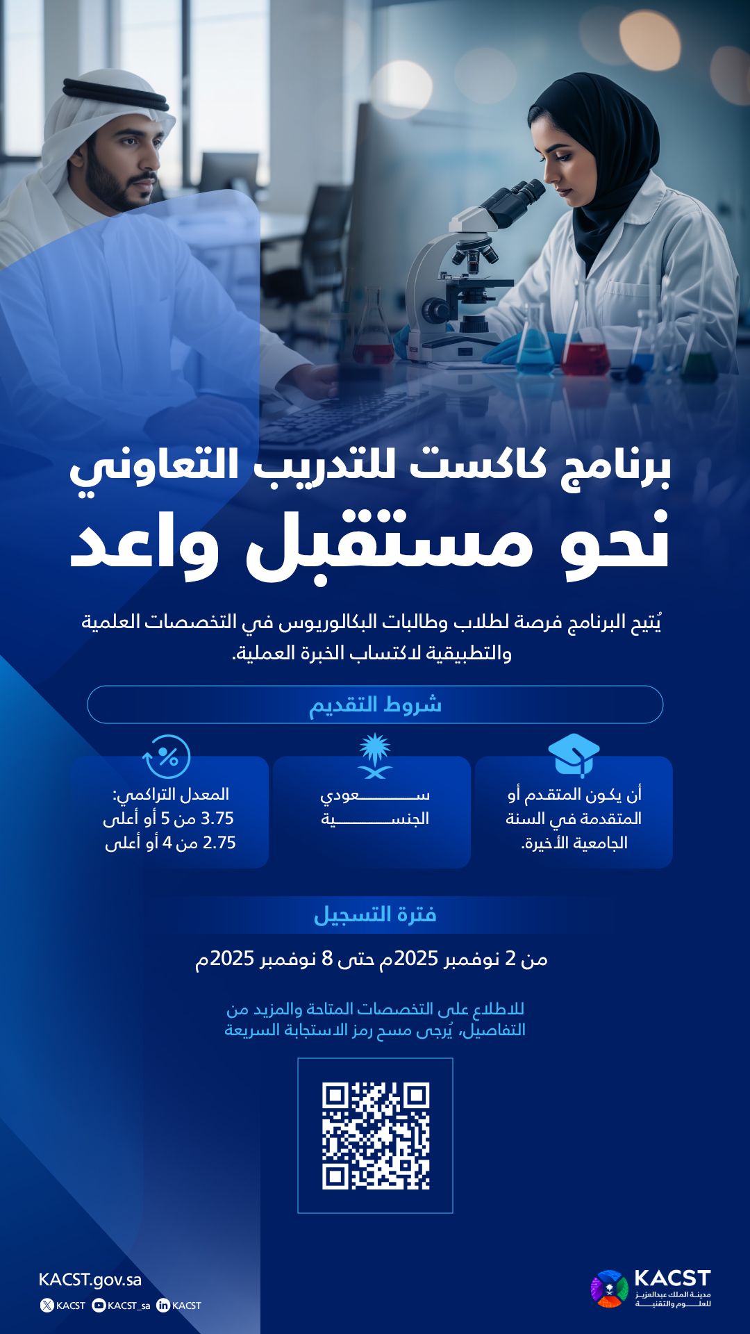 تعلن مدينة الملك عبدالعزيز للعلوم والتقنية عن فتح باب التقديم في برنامج (كاكست للتدريب التعاوني) للفصل الدراسي الأول لعام (1447م) لطلاب وطالبات الكليات والجامعات في مرحلة الدبلوم والبكالوريوس بالتخصصات (الإدارية، التقنية، العلمية، الهندسية، الفنية، التطبيقية، الصحية) على النحو التالي: